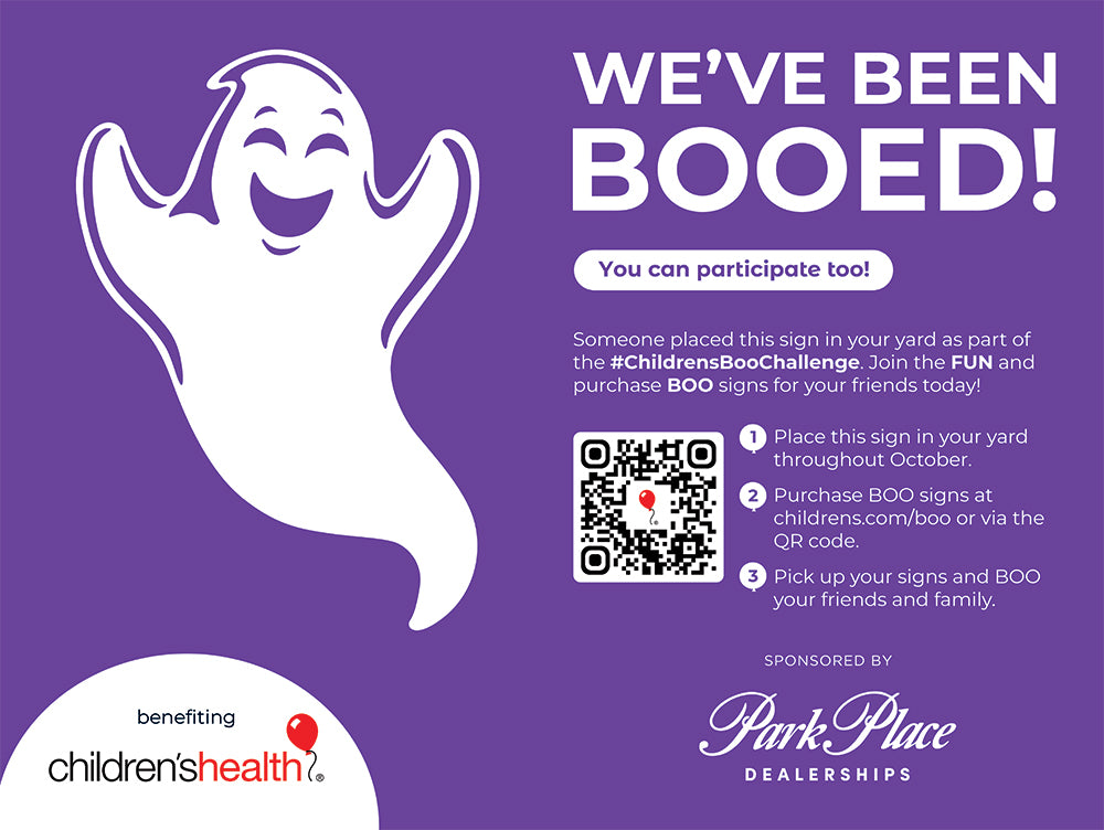 Join the 2025 BOO Yard Sign Challenge, presented by Park Place Dealerships, and support Children's Health℠. Simply purchase a BOO sign and secretly place in the yards of friends and neighbors throughout the community. Attaching Halloween treats to the yard sign is also a fun way to surprise your friends and neighbors.